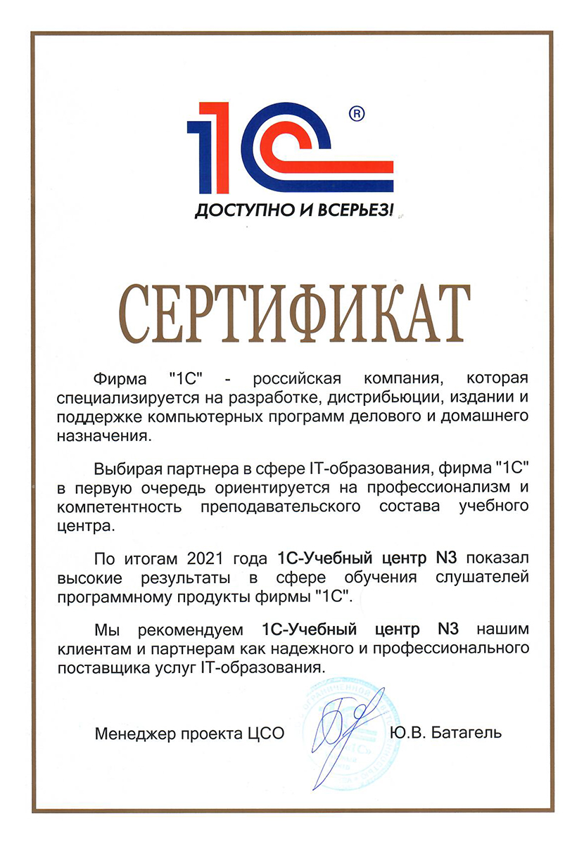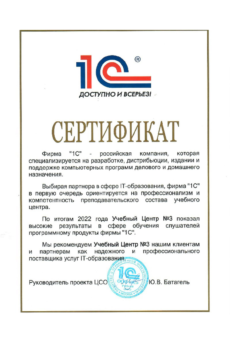 1С-Учебный центр №3 - совместный проект фирм «1C» и «Аналит». Учебный центр уже более 20 лет (с 2000г.) проводит курсы для программистов и пользователей по программным продуктам фирмы "1С". Наша основная задача - обеспечить качественное обучение слушателей, чтобы, пройдя курс, специалист мог работать самостоятельно и эффективно.
